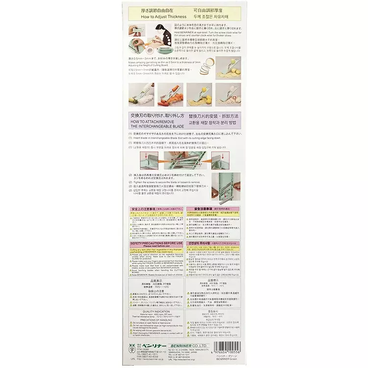 The Benriner Super Mandoline features a sharp, super high quality stainless steel blade which provides a clean and smooth cut.